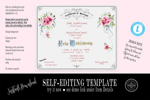 Vintage Marriage Certificate Template Editable Printable Designs