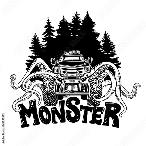 Vector Monster Truck With Tentacles Of The Mollusk And Forest Landscape Mystical Animal Car Tattoo Adventure Travel Outdoors Art Symbols 4x4 Off Road Buy This Stock Vector And Explore Similar Vectors