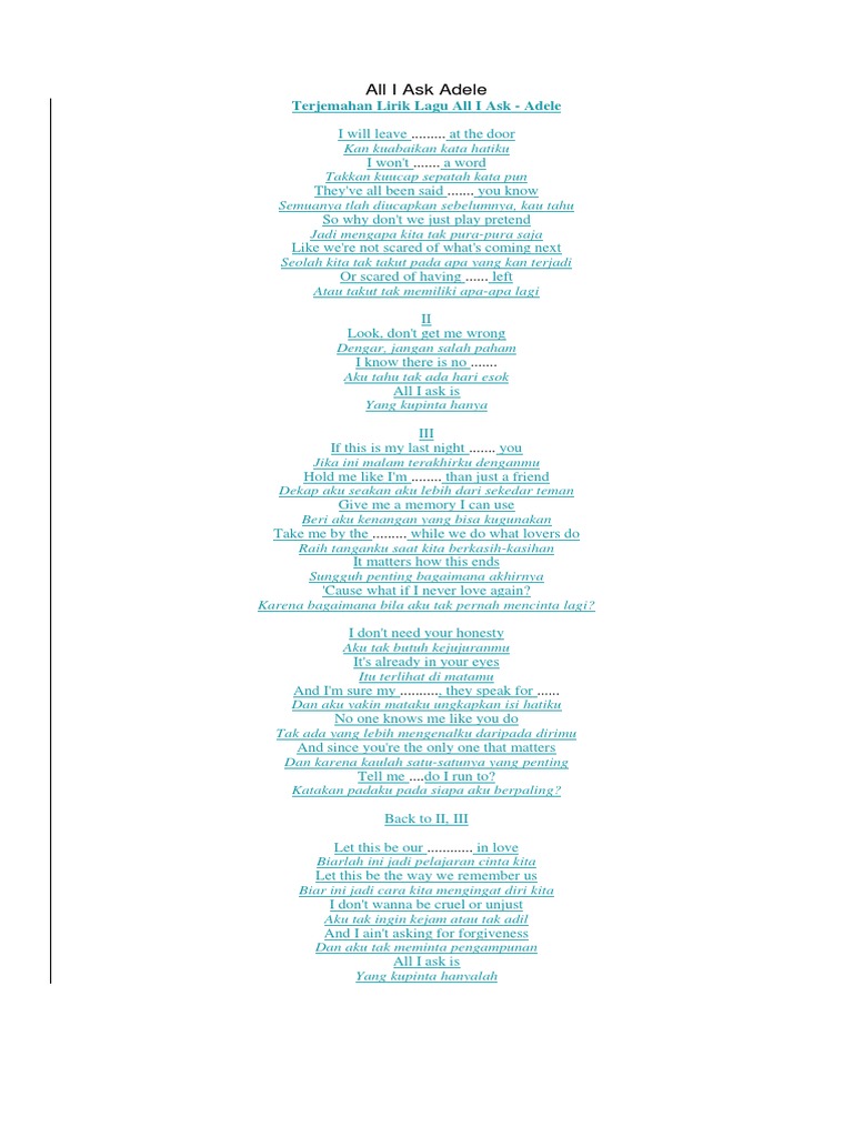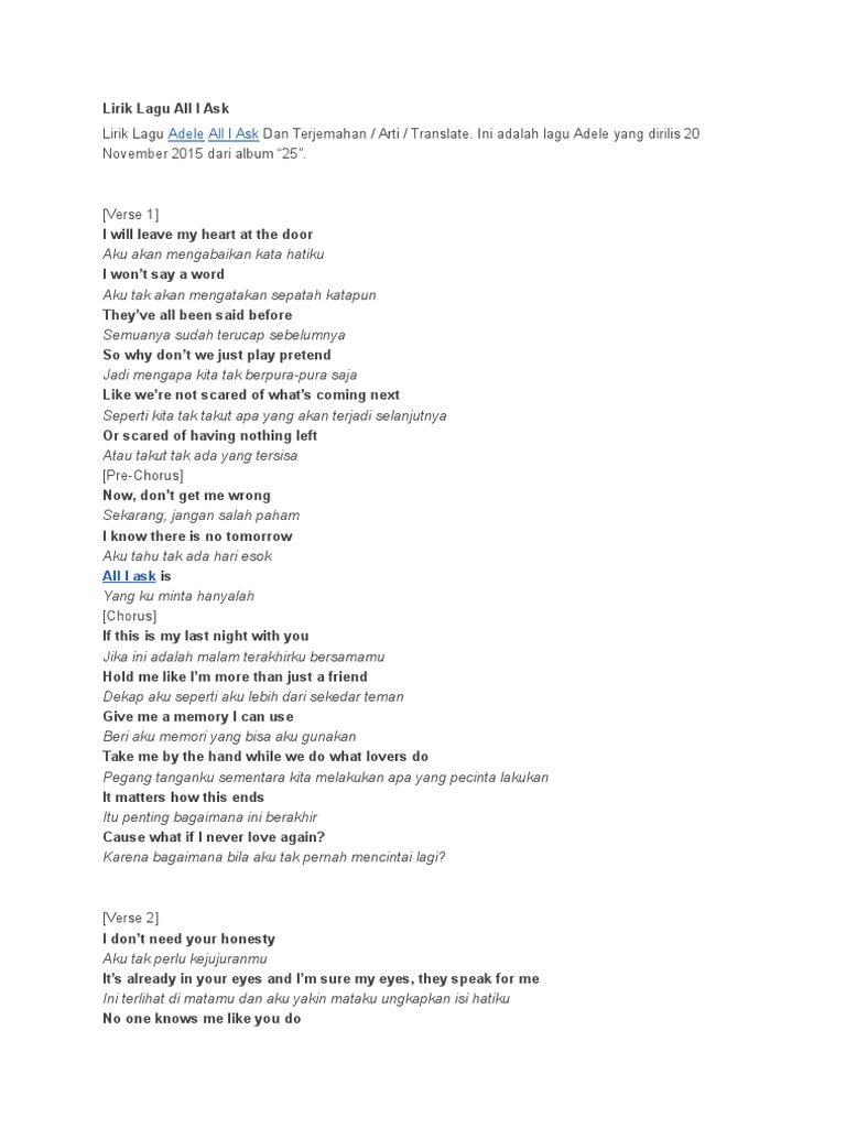 Adele all i ask. Title all i ask artist adele lirik indonesia akan kutingalkan hatiku di pintu aku tak kan katakan sepatah katapun mereka semua sudah mengatakan sebel. All i ask adele lyrics audio of a live performance i do not own anything all credits go to the right owners. I will leave my heart at the door i wont say a word theyve all been said before you know so why dont we just play pretend like were not scared of what is coming next.