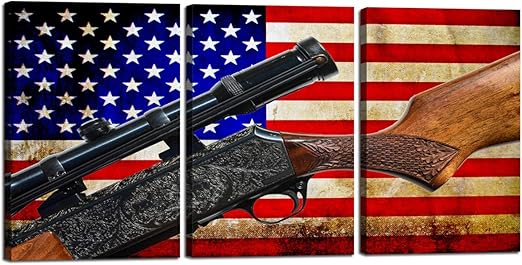 Framed Wall Art For Home Office Decorations 3 Pieces Gun On American Flag Pictures Premium Canvas