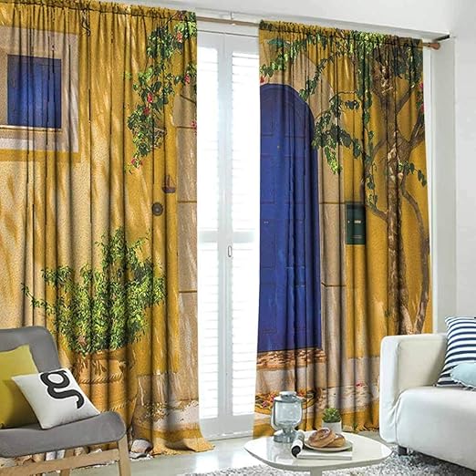 Yellow And Blue Design Artistic Modern For Living Room Or Bedroom Traditional Greek House Door With Flowers And Tree Mediterranean Scenery Sliding Curtains For Bedroom Multicolor W84 X L108 Inch Amazon Ca Home
