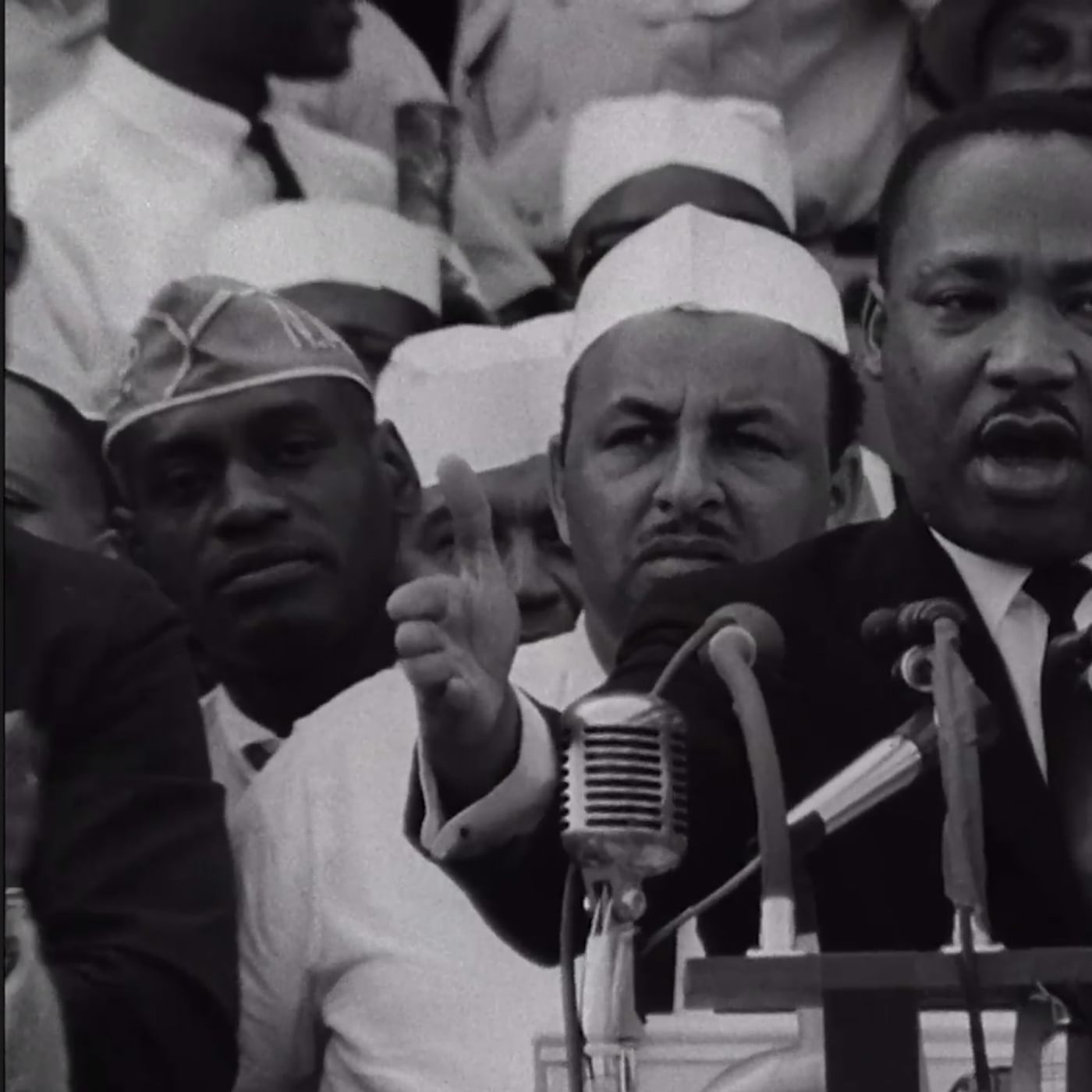 Waves to participants in the civil rights movements march on washington from the lincoln memorial.