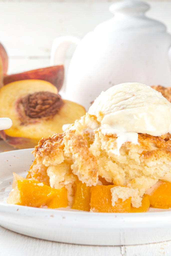 The magic happens in the oven as the cake mix combines with the peach syrup and melted butter to create a soft, cake-like crust over the sweet, warm peaches.