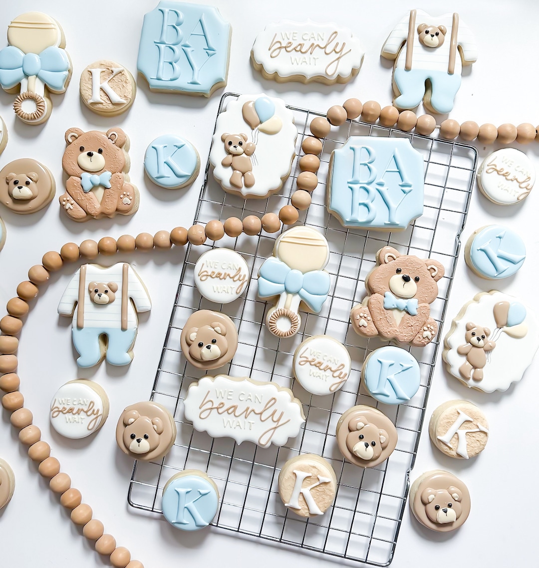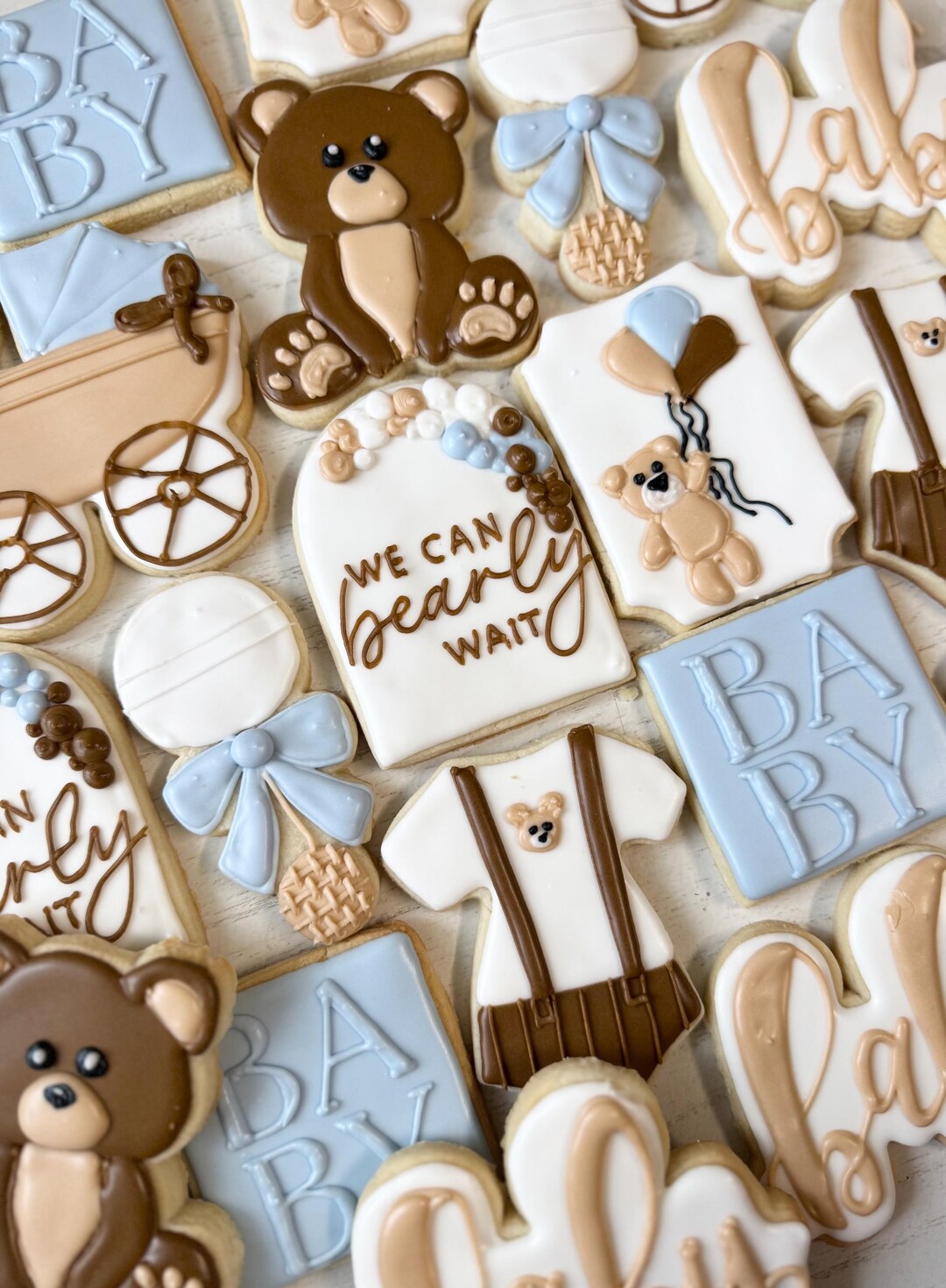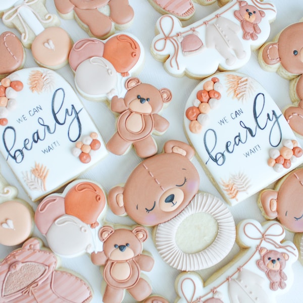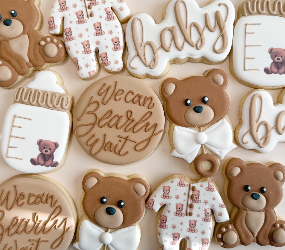 - "We can bearly wait cookies" are custom-decorated sugar cookies, typically shaped like bears or featuring bear motifs, often adorned with phrases like "We Can Bearly Wait" to signify anticipation for an upcoming event, most commonly a baby's arrival.