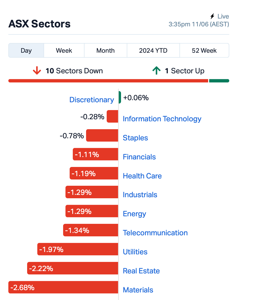 The decline was exacerbated by falling copper and iron ore prices, which further depressed the materials sector, a huge component of the overall ASX 200 index.